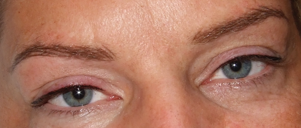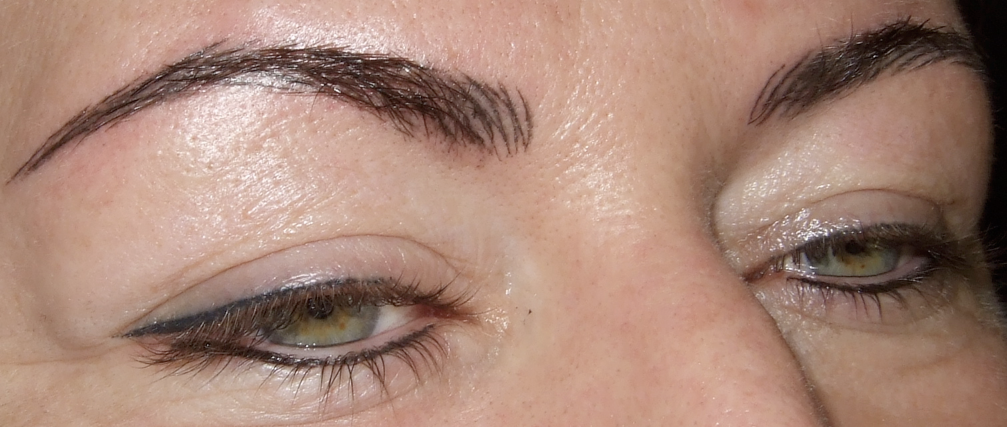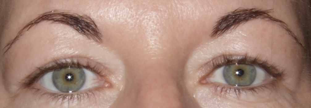 der obere Lidstrich ist nach der Erstbehandlung noch zu dezent. Augenbrauen und unterer Lidstrich: direkt nach der Behandlung, werden noch dezenter.